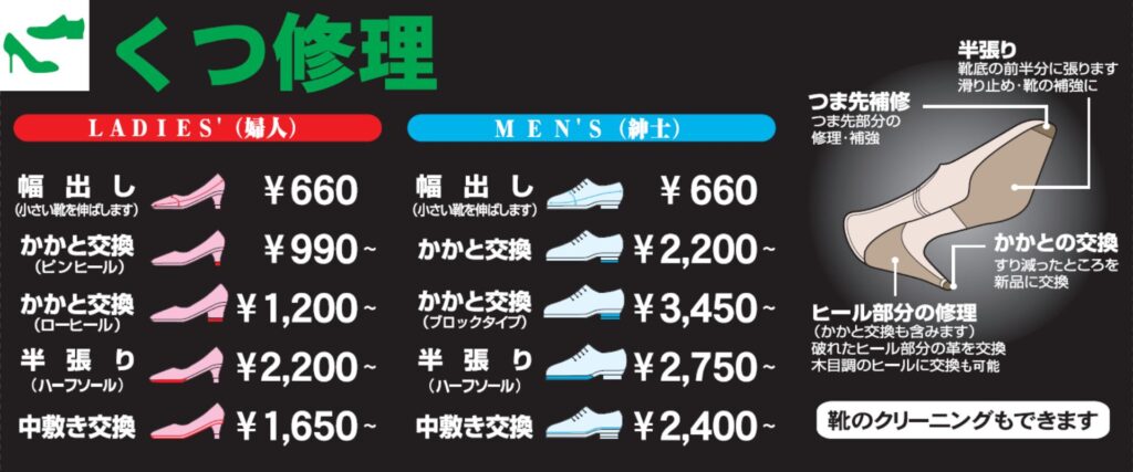料金例は1足分(靴左右両足)の修理料金です